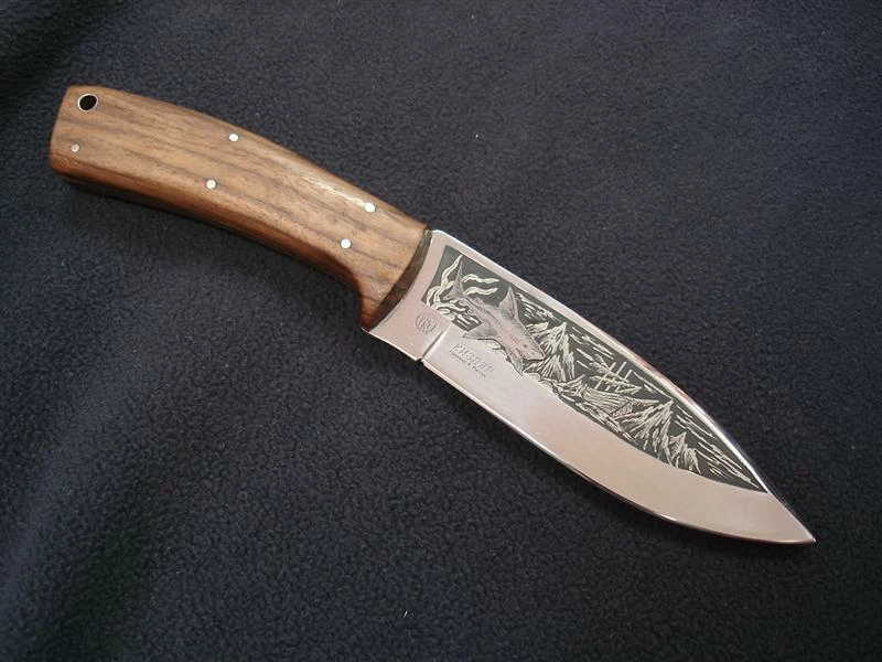 When producing blades, Russian stainless steel, carbon and last but not least high quality damask steel of our own production is used. Steel 65X 13 is used in the basic variant. After tempering to 56 β 58 HRC temper, this steel facilitates excellent cutting characteristics for aΒ longer time. Blades are different thanks to comeback to traditions which includes decoration with various decorative motives. These involve hunting scenes, pictures of wildlife and birds or the traditionally stylised plant motive. Furthermore, each product can be embellished with silver, nickel silver or blackening. The final look of each knive is unique and ever unrepeatable. An individual sheath is produced for each knife or sabre which can also be decorated with traditional motives using stamping or engraving.